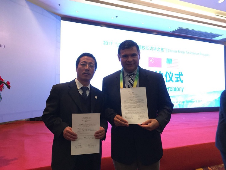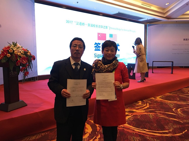 国家汉办组织的一年一度“汉语桥---美国校长访华之旅”代表团高中组Scott Maxwell一行七人于2017年11月8日上午到泰安一中新校区进行教育交流访问。本次访问团成员包括美国大学理事会官员、美国各州高中校长和各州校区教育官员。 访问团走进课堂,老师的全英文授课模式、学生流利的英语表达、小组围坐的讨论形式等,得到了美国校长的高度评价。同学们就美国高中学生的学习、生活以及美国历史、文化等话题进行了提问,美国校长和学区领导就相关话题一一解答,话题丰富,讨论热烈。科瑞尼学区主管Scott先生代表访问团用汉语发表了简短的访问感言并接受了市教育电视台的专访。Scott先生对美丽宏大的一中新校区校园和先进优良的现代化教学设施印象深刻,特别是家长参与课堂的大胆尝试,他表示极为赞赏。家长代表对家长参与课堂这一做法的益处以及拓展学生国际视野和学好英语的重要性等做了简要发言。 访问团来到会议室,常希贞校长向客人介绍了我校的悠久历史、发展历程、教育教学、学生发展、国际交流与合作等情况。访问团对此深感兴趣并表达了进行教育交流合作的意向。下午,中美校长论坛结束后,休斯顿国际化学习私立学校、科罗拉多州私立学校和凯撒查韦斯高中分别与我校签署了合作备忘录。 访问团还参观了新校区学生的课间操活动、学校餐厅和学生宿舍。 此次访问活动,激发了学生学习英语的兴趣,提供了良好的提高英语口语的机会,拓展了学生的国际视野,也为我校深入开展国际交流和合作拓宽了新的渠道。 ![]() ![]() ![]() ![]() ![]() ![]() ![]() ![]()