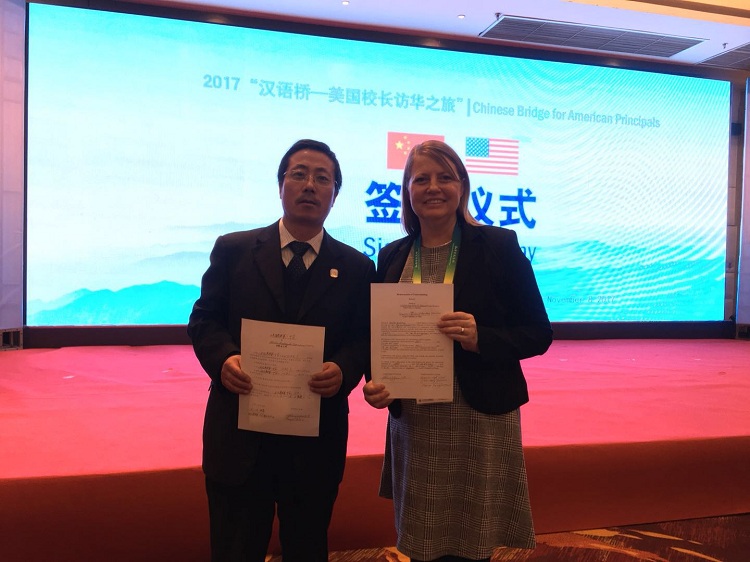 国家汉办组织的一年一度“汉语桥---美国校长访华之旅”代表团高中组Scott Maxwell一行七人于2017年11月8日上午到泰安一中新校区进行教育交流访问。本次访问团成员包括美国大学理事会官员、美国各州高中校长和各州校区教育官员。 访问团走进课堂,老师的全英文授课模式、学生流利的英语表达、小组围坐的讨论形式等,得到了美国校长的高度评价。同学们就美国高中学生的学习、生活以及美国历史、文化等话题进行了提问,美国校长和学区领导就相关话题一一解答,话题丰富,讨论热烈。科瑞尼学区主管Scott先生代表访问团用汉语发表了简短的访问感言并接受了市教育电视台的专访。Scott先生对美丽宏大的一中新校区校园和先进优良的现代化教学设施印象深刻,特别是家长参与课堂的大胆尝试,他表示极为赞赏。家长代表对家长参与课堂这一做法的益处以及拓展学生国际视野和学好英语的重要性等做了简要发言。 访问团来到会议室,常希贞校长向客人介绍了我校的悠久历史、发展历程、教育教学、学生发展、国际交流与合作等情况。访问团对此深感兴趣并表达了进行教育交流合作的意向。下午,中美校长论坛结束后,休斯顿国际化学习私立学校、科罗拉多州私立学校和凯撒查韦斯高中分别与我校签署了合作备忘录。 访问团还参观了新校区学生的课间操活动、学校餐厅和学生宿舍。 此次访问活动,激发了学生学习英语的兴趣,提供了良好的提高英语口语的机会,拓展了学生的国际视野,也为我校深入开展国际交流和合作拓宽了新的渠道。 ![]() ![]() ![]() ![]() ![]() ![]() ![]() ![]()