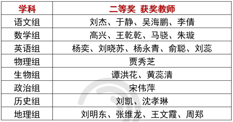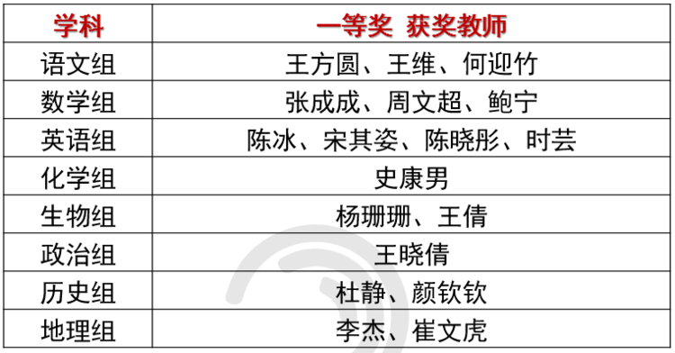 截至2019年11月7日,高三青年教师第一阶段讲题能力比赛圆满落幕,共评出一等奖18人,二等奖23人,以下为获奖名单: