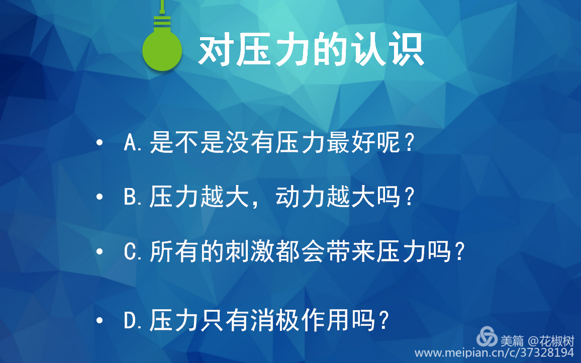 适度的压力能使人的情绪处于兴奋状态,并且可以活跃思维,增加反应速度,此时对人是有益的,同时会产生正面效应。然而压力过大,便会带来许多负面影响,这就可能导致高中学生心理失衡,在高压环境下更易产生生理疾病或心理的困扰。