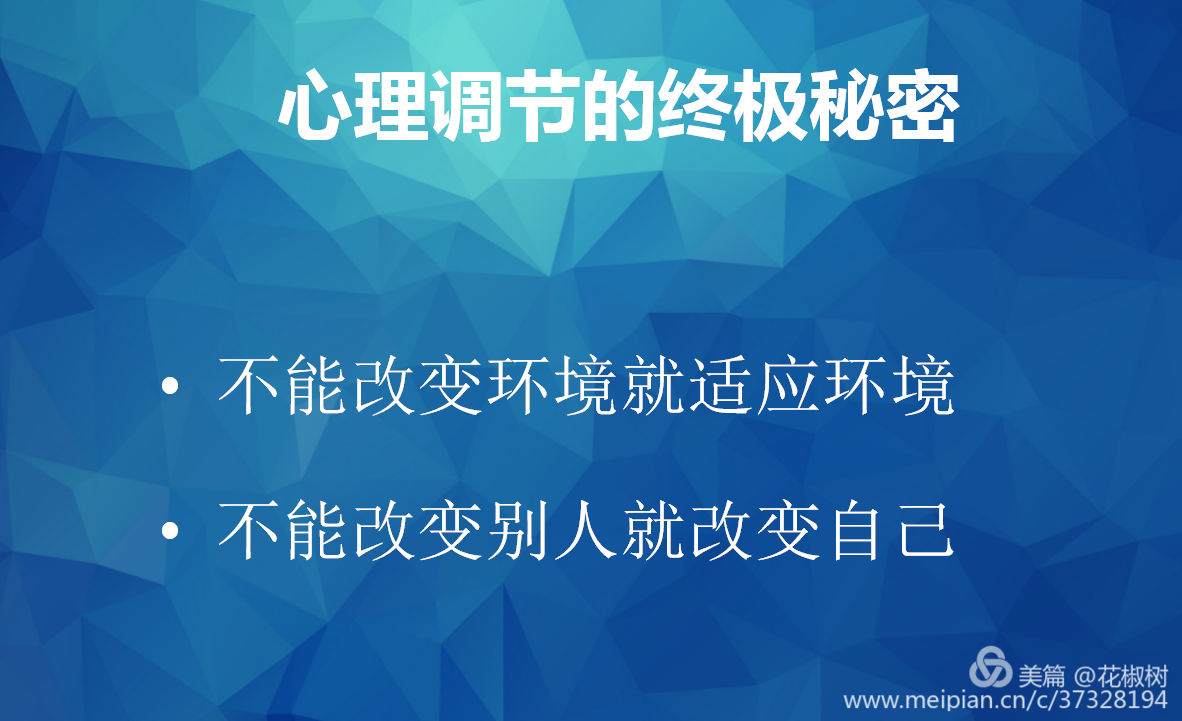 孔主任还援引中国古典诗词名句帮助大家去理解:“横看成岭侧成峰,远近高低各不同”——告诉我们,要多角度看问题;“不识庐山真面目,只缘身在此山中”——告诉我们,要跳出自己看自己;“人有悲欢离合,月有阴晴圆缺,此事古难全”——告诉我们,要接纳人生的不完美;“大江东去,浪淘尽,千古风流人物”——告诉我们,一切人和事都在变化。孔主任总结传授给我们心理调节的终极秘密就是“不能改变环境就适应环境,不能改变别人就改变自己”。