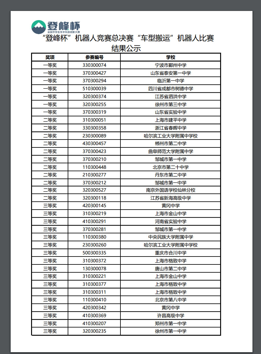 2017年8月19日至8月23日,第二届“登峰杯”全国中学生学术科技创新大赛全国总决赛在北京举行。我校2016级6班王邦齐、2016级15班赵靖宇、2016级20班有润泽、陈泽旭等四名同学组成的泰安一中机器人竞赛队,以第二名的优异成绩获得全国总决赛一等奖。 我校第一次组织参加登峰杯大赛,校团委积极组织,指导教师团队倾力培养,各竞赛单元在各个赛段均取得了优异的成绩。共有38名同学在学术作品竞赛单元、数据挖掘竞赛单元、数学建模竞赛单元、机器人竞赛单元获得全国奖项。 指导教师团队:机器人竞赛单元指导教师 鲁克营 学术作品竞赛单元指导教师 董艳群 数据挖掘竞赛单元指导教师 亓瑶 “登峰杯”是“登峰杯全国中学生学术科技创新大赛”的简称,是由清华大学教育研究院、中国高等教育学会学习科学研究分会共同主办,中国工业与应用数学学会、中国自动化学会机器人竞赛工作委员会、上海交通大学船舶海洋与建筑工程学院、中国科学技术大学计算机科学与技术学院联合承办,中国教师发展基金会教育评价专项基金提供支持的全国中学生学术科技创新大赛,旨在为促进青少年拔尖人才的成长搭建一个高水平、高质量的学术创新平台,展现中学生学术素养和创新能力,探索青少年学术创新人才的培养路径。(团委与边疆办) ![]() ![]()