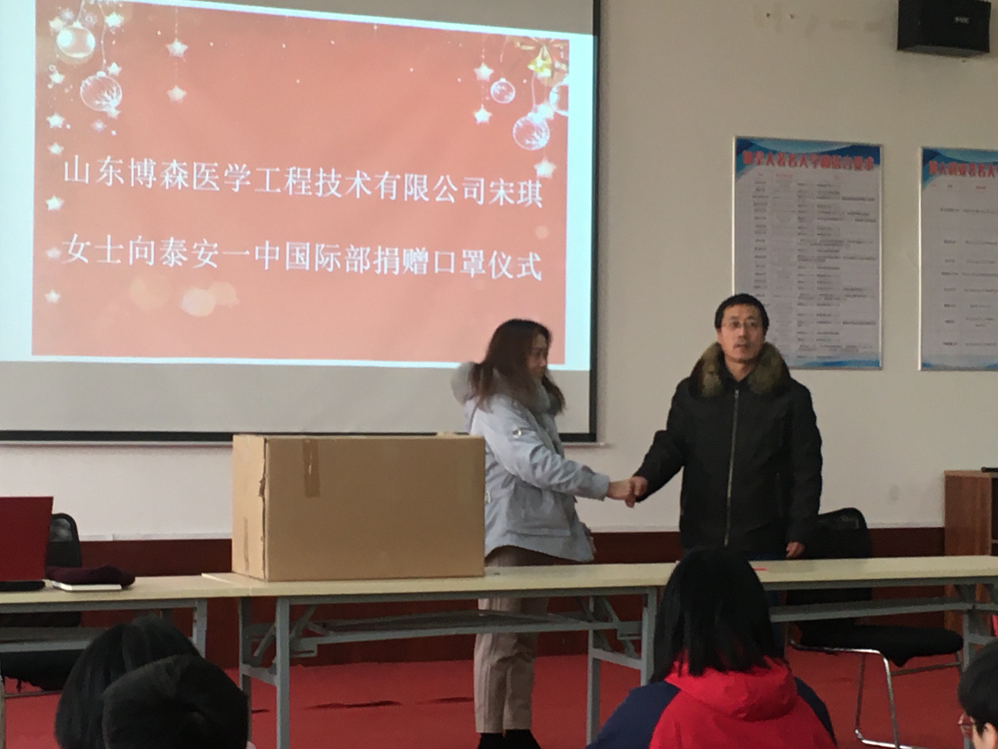 泰安一中国际部学生刘凌初家长向国际部师生捐赠2000只医用N95口罩 |