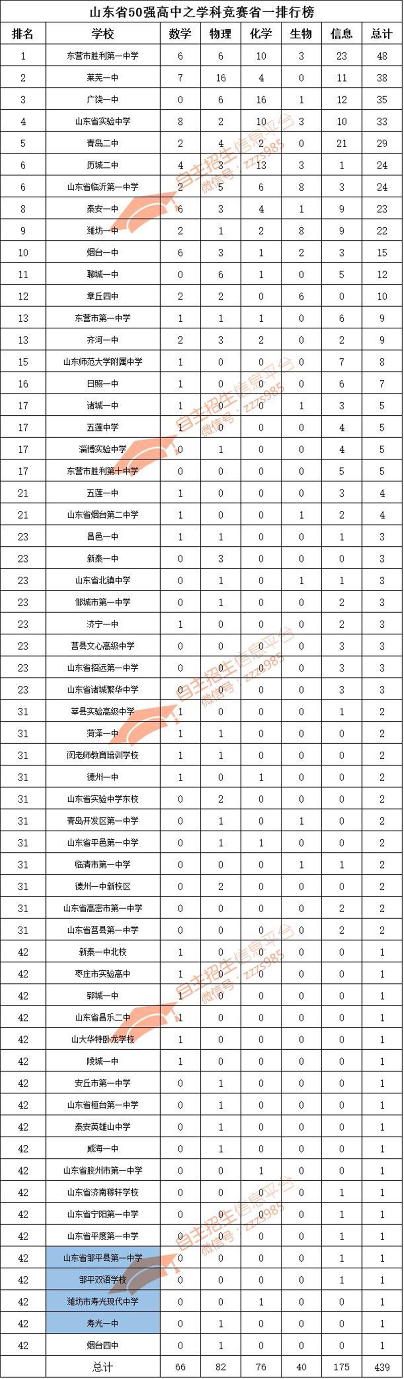 近日,学科竞赛网联合自主招生信息平台共同发布了《2017山东省50强高中之学科竞赛“省一”排行榜》。泰安一中凭借数学竞赛6人、物理竞赛3人、化学竞赛4人、生物竞赛1人、信息学竞赛9人,“省一”名额共计23人的优异成绩位列第八。 近年来,泰安一中秉承百年老校、大气深沉的底蕴,坚持培养学生综合素质和创新潜质,重视特长生培养,以学科竞赛为重要载体,实行主教练负责制,坚持学生兴趣主导,教师引导,采取多种形式,扎实开展特长生培养。经过多年的努力和实践形成了优秀的教练团队、系统科学的培养体系,数学、物理、化学、生物、信息学竞赛均取得了优异的成绩。 附:《2017山东省50强高中之学科竞赛“省一”排行榜》 ![]()