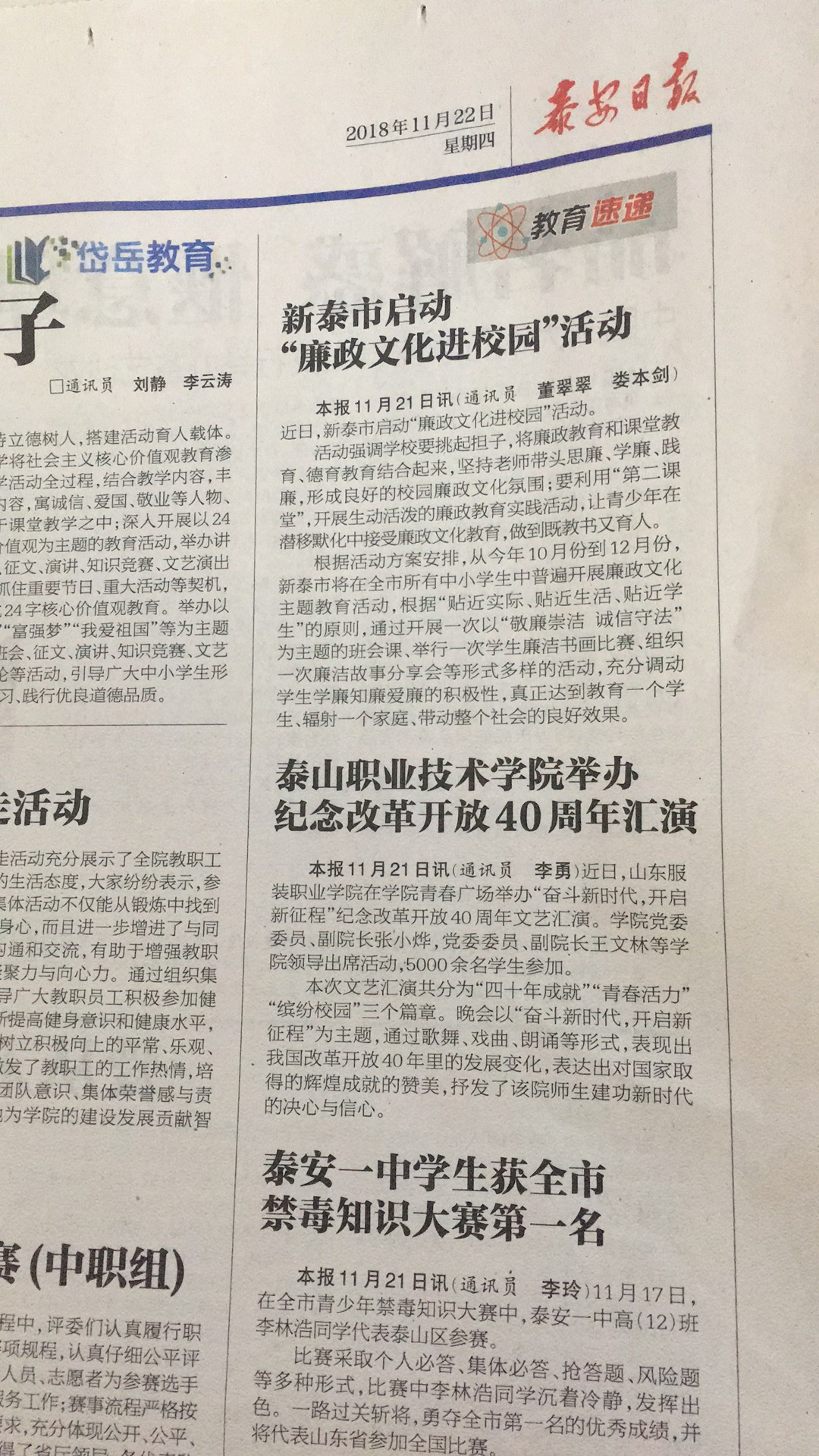 泰安日报:泰安一中高一学生获全市禁毒知识大赛第一名