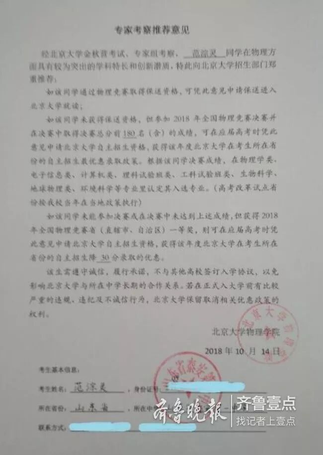 享受北京大学物理金秋营签约降分录取优惠名单 范淙灵,泰安一中2016级学生,性格活泼开朗,尊敬师长,乐于助人,酷爱物理学习研究,各科学习均衡发展,学业成绩始终位居年级前茅,是学校品学兼优学生的优秀代表。