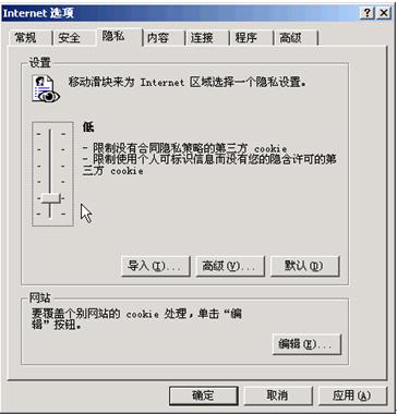 第二步: 点击“Ineternat选项”对话框中的“隐私”选项卡,将你的隐私设置设为“中”或者“低”,并点击 确定,返回。如图: