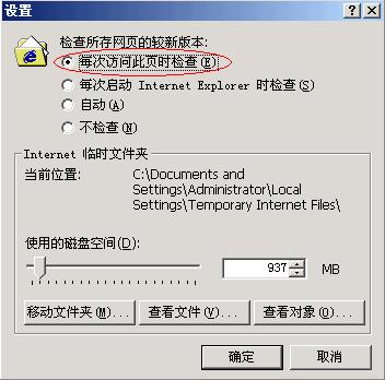 第三步: 点击“Ineternat选项”对话框中的“常规”选项卡,点击你的Internet临时文件“设置”按钮,在弹出的对话框中,找到“检查所存网页的较新版本”设置项,设置为每次访问此页时检查,并单击确定,如图: