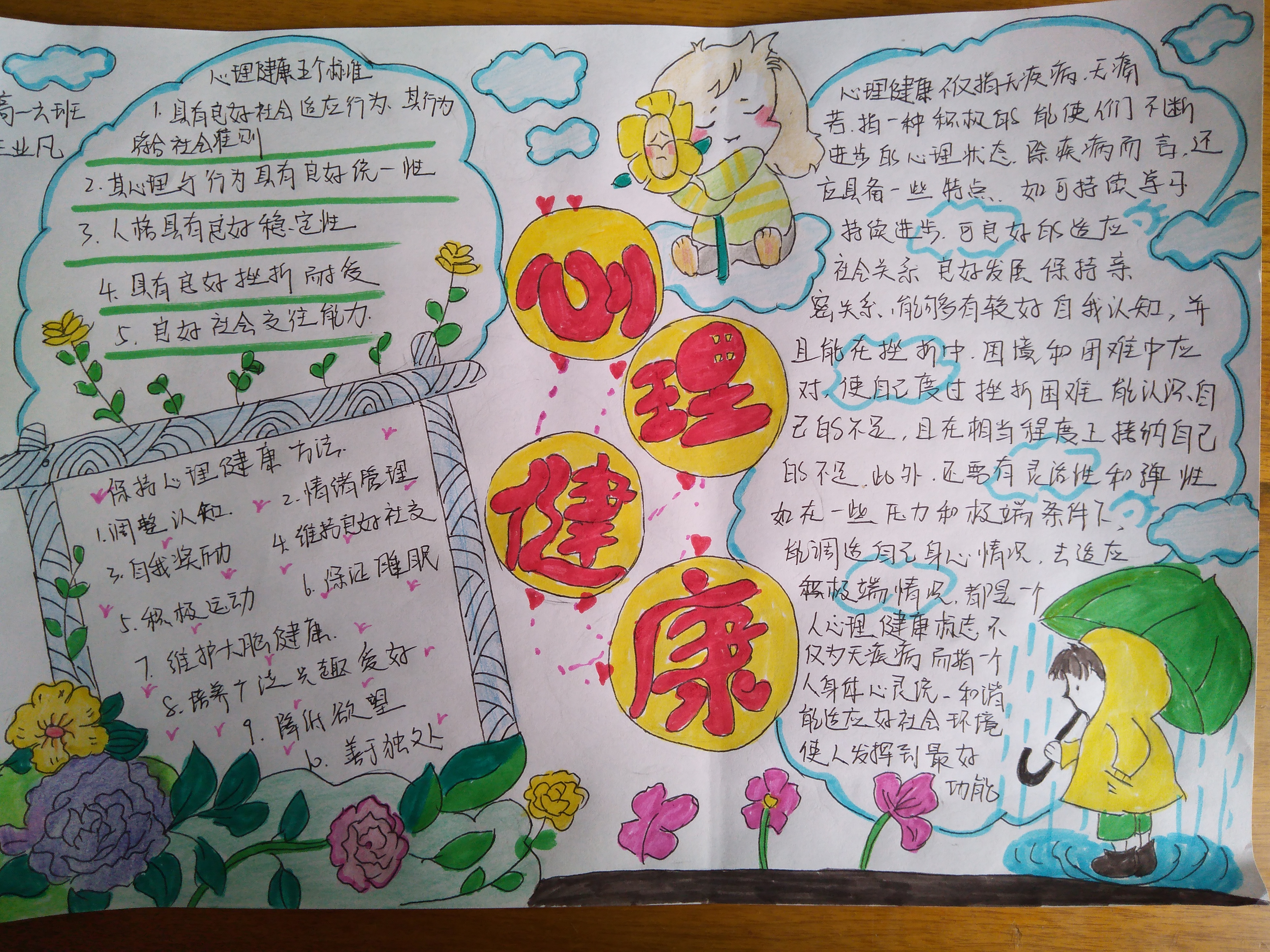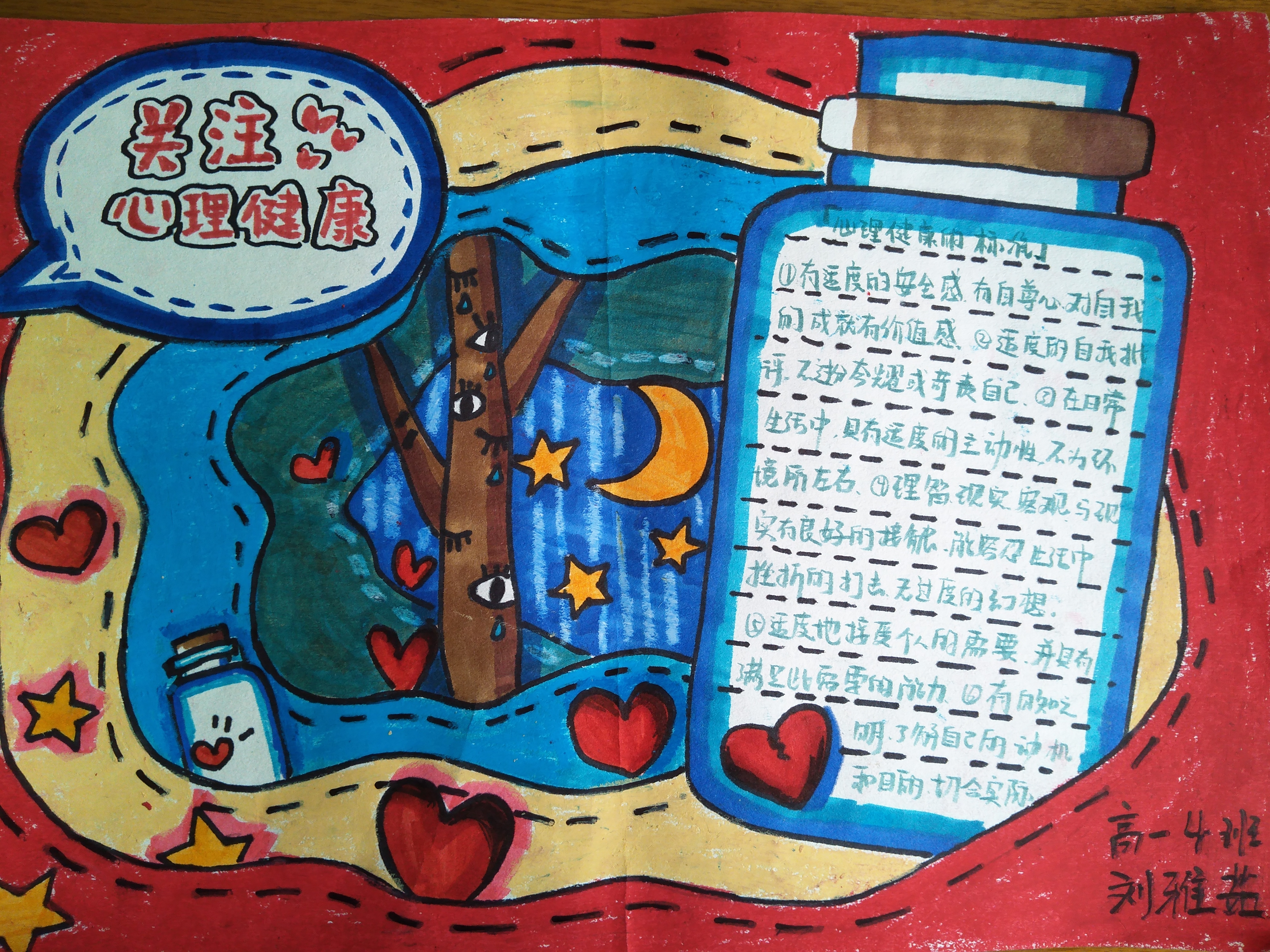 为了更好地普及心理健康教育常识,提高学生的心理自我调节能力,丰富学生的文化生活.近期,泰安一中开展了心理健康手抄报比赛活动。 本次手抄报活动的主题以心理健康教育常识为主,各班心理委员精心组织,同学们积极参与, 借助手中的画笔绘制成了一幅幅版面精美、内容丰富、布局新颖、短小精悍、书写清晰的手抄报作品。心理咨询室的老师和美术办公室老师组成了评审小组,经过认真的评比,本次心理健康手抄报比赛,评出一等奖15人,二等奖14人,优秀奖13人。 2021年心理健康手抄报比赛获奖名单: 一等奖15人 李怡然 王欣然 欧阳佳凝 张泽瑞 梁佳琪 马静怡 宋辰宇 王晓宇 孙淑贤 刘雅茹 王姿媛 张旖旎 王业凡 王雨菲 高 丰 二等奖14人 潘光耀 郭轩辰 李新实 和怡君 张建伟 侯韵函 杨一帆 张仁泽 赵 晨 王俊瑞 王文硕 褚心月 孙玉涵 吴再格格 优秀奖13人 张骞宇 刘旺运 张宪政 韩梦飞 张子恒 张凡锐 吕奕麟 马明阳 赵嘉丽 吕博文 次珠旺久 尼玛曲珍 桑吉卓玛 【部分获奖作品展】